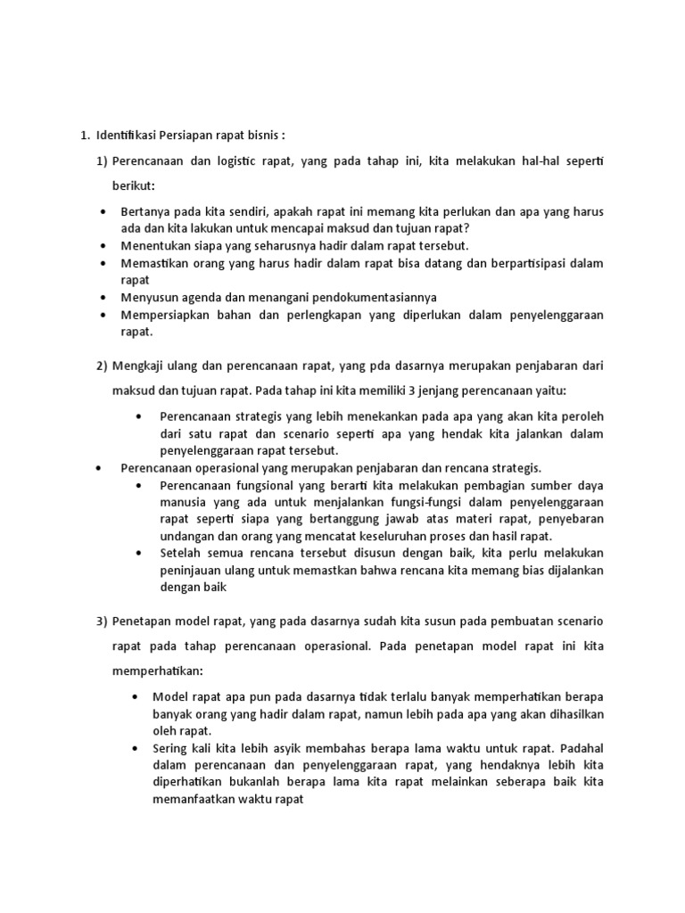 Identifikasi Persiapan rapat bisnis Jawab: PERENCANAAN RAPAT BISNIS Perencanaan (planning) yang baik tentu dapat membantu mempermudah pencapaian tujuan yang dikehendaki. Begitu pula dalam rapat bisnis yang efektif sangat ditentukan oleh sejauh mana persiapan yang telah dilakukan, apakah sebuah rapat bisnis dipersiapkan sekadarnya (asal-asalan) atau dipersiapkan dengan sebaik-baiknya. Dec 27, 2017 · Ceklist Persiapan Meeting. November 4, 2020. December 27, 2017 by MetroBogor. Ini bukan artikel tentang Bogor. Tapi, mungkin berguna bagi para sekretaris atau siapa saja yang sering terlibat dalam pengaturan meeting. Baik urusan bisnis, kantor atau meeting even apapun dan dimanapun. Bogor tentu saja punya banyak tempat meeting yang asyik.