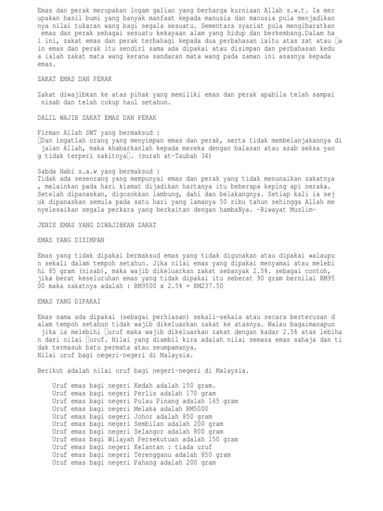 Zakat emas dan perak. Mata wang wajib dikenakan zakat kerana ia boleh digunakan untuk bermuamalah sama dengan emas dan perak. Wang sama ada berbentuk kertas, syiling atau sebagainya setaraf dengan emas dan perak sebagai satu kuasa membeli. Nisab zakat emas adalah berdasarkan nilai semasa bagi nisab emas 20 mithqal (85 gram) atau perak (595 gram). Jumhur fuqaha telah menyandarkan … 6.5.2012 · Wang logam ini diperbuat daripada timah yang dipanggil calains 4. Pada permukaan wang timah ini dipahat nama sultan yang memerintah Melaka pada masa itu 5. Penggunaan mata wang emas, perak dan timah juga digunakan. Mata wang ini dibawa dari Pedir,Pasai, Kembayat dan Gujerat Penggunaan Sistem Mata Wang 1. Haluaisimme näyttää tässä kuvauksen, mutta avaamasi sivusto ei anna tehdä niin. 05 - Zakat Wang Simpanan 06 - Zakat Emas 07 - Zakat Perak 08 - Zakat Pertanian 09 - Zakat Ternakan 10 - Zakat Rikaz @ galian 11 - Qadha Zakat 12 - Saham wakaf Pahang. 10. Pusat Zakat Perak (Majlis Agama Islam dan Adat Melayu Perak Darul Ridzuan) Please enter your I/C no. For example, enter the I/C no. as A7418529 or 720101111212 . Please enter ...