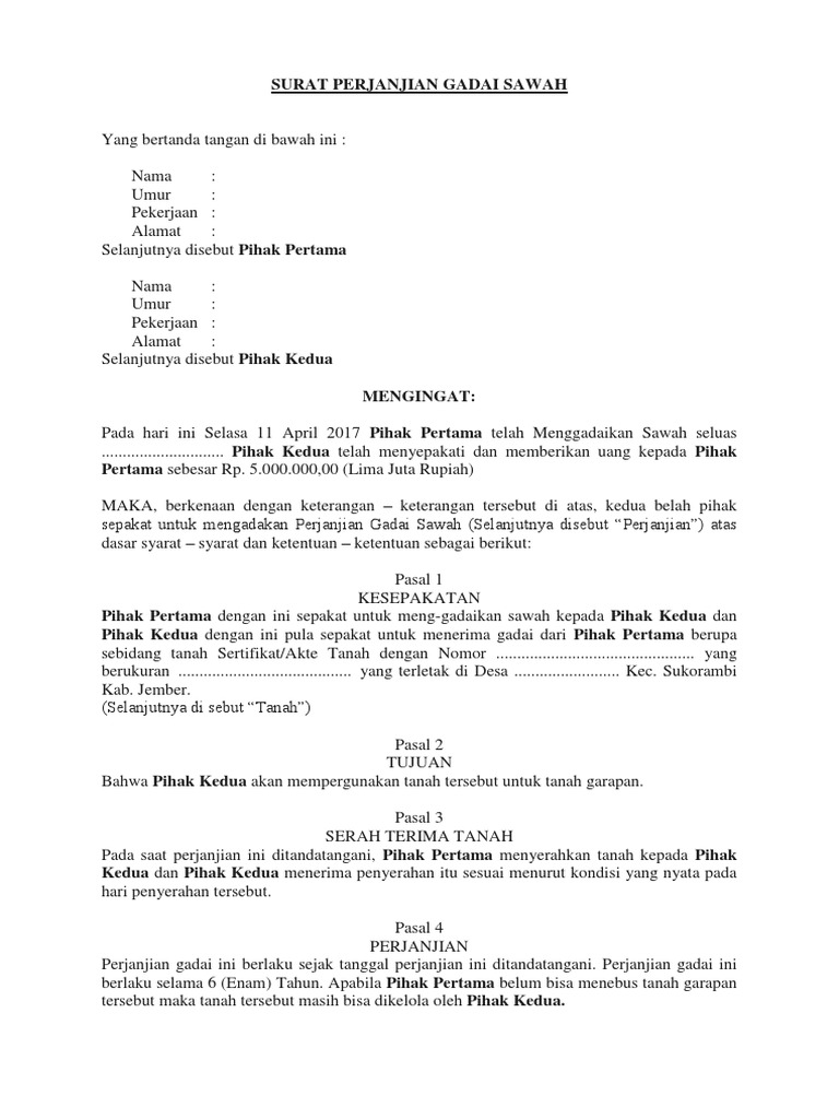 Surat perjanjian gadai sawah diatas berisi tentang kesepakatan antara kedua belah pihak dengan menjadikan sawah sebagai barang jaminan untuk pemberian hutang. Djunaedi wardono tempat tgl lahir. Contoh surat undangan wisuda dalam bahasa inggris. Surat perjanjian gadai sawah. Surat perjanjian penggadaian sawah.