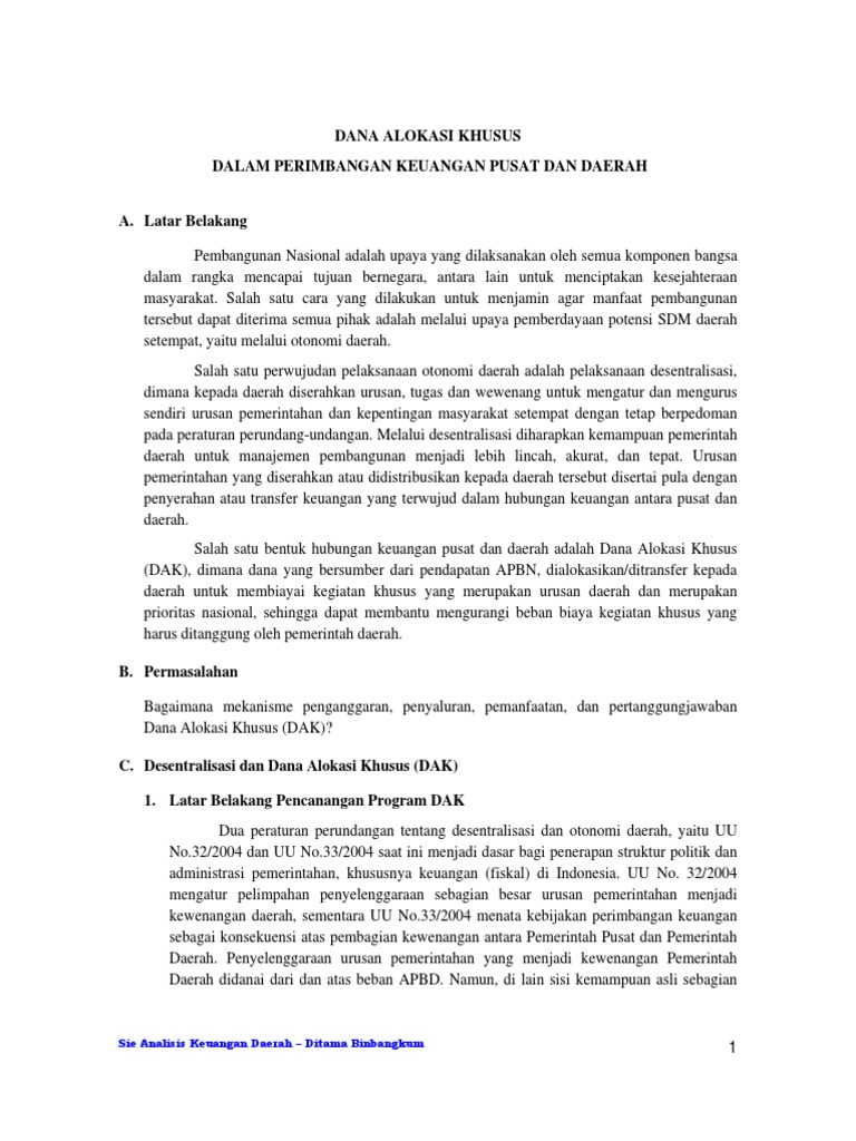 Makalah ini membahas mengenai Dana Perimbangan serta berbagai persoalan mengenai Dana Alokasi Umum (DAU) dan Dana Alokasi Khusus (DAK). Pada kesempatan ini kami selaku mahasiswa menyampaikan ucapan terima kasih kepada Dedy Yuliawan, S.E., M.Si. selaku Dosen Mata Kuliah Ekonomi Publik II dan pihak lain yang telah memberikan arahan dan bimbingan ... Dana Alokasi Khusus. Dana Alokasi Khusus (DAK) adalah dana yang bersumber dari pendapatan APBN yang dialokasikan kepada daerah tertentu dengan tujuan untuk membantu mendanai kegiatan khusus yang merupakan urusan daerah dan sesuai dengan prioritas nasional. Selengkapnya…. 18 January 2016 / Ebook, Edukasi, Publikasi. Dana Alokasi Khusus (DAK) digunakan untuk membiayai investasi pengadaan dan atau peningkatan prasarana dan sarana fisik secara ekonomis untuk jangka panjang. Dalam keadaan tertentu, Dana Alokasi Khusus dapat membantu biaya pengoperasian dan pemeliharaan prasarana dan sarana tertentu untuk periode terbatas, tidak melebihi 3 (tiga) tahun. 2.