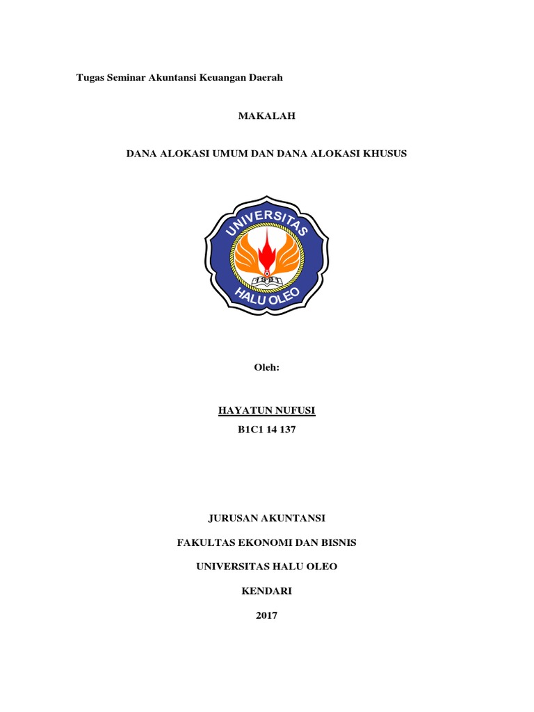 Makalah dana alokasi khusus. Secara sederhana pengelolaan dana pendidikan mencakup dua aspek : 1. dimensi penerimaan atau sumber dana 2. dimensi pengeluaran atau alokasi dana. Makalah Pengelolaan Pendidikan Kelompok 3 | BAB II 4 9. Dana Alokasi Khusus. Dana Alokasi Khusus, selanjutnya disebut DAK, adalah dana perimbangan dan bersumber dari pendapatan APBN yang dialokasikan kepada daerah tertentu de ngan tujuan untuk membantu mendanai kegiatan khusus yang merupakan urusan daerah dan sesuai dengan prioritas nasional. Anggaran tersebut digunakan rata-rata digunakan untuk ... Makalah ini bertujuan untuk membahas Dana Alokasi Umum (DAU) dan kegagalan otonomi daerah secara ringkas. Pembahasan. Dana Alokasi Umum (DAU) Dana alokasi umum adalah bagian terpenting dari sebagian besar pendapatan pemerintah daerah di Indonesia. dana perimbangan agar lebih sesuai dengan tantangan baru dan dinamika pendanaan pembangunan yang terdesentralisasi. Untuk pendanaan pembangunan yang berasal dari DAK (Dana Alokasi Khusus), meskipun proporsinya terhadap keseluruhan dana perimbangan relatif kecil (sekitar 7%, APBN 2010), munculnya berbagai permasalahan,