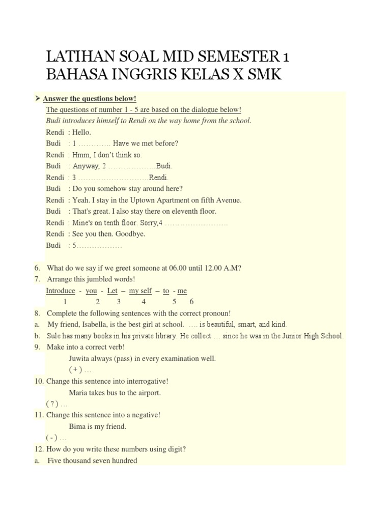 Bank soal bahasa inggris kelas 10 semester 1. Sambil mengerjakan soal, kamu juga bisa berlatih membiasakan diri dengan durasi ujian yang diberikan dan tingkat kesulitan soalnya. Untuk itu, detikEdu merangkum sejumlah contoh soal UAS bahasa Inggris kelas 10 semester 1 dari Pasti Bisa Bahasa Inggris untuk SMA/MA Kelas X oleh Tim Ganesha Operation. Yuk, coba latihan soalnya! 26 Jan 2021 — Di artikel ini kita akan membahas tentang soal Bahasa Inggris Kelas 10 Semester 1 berserta kunci jawabannya untuk ajaran tahun baru 2020/2021. Soal PAS Bahasa Inggris Kelas 4 Semester 1 dan Kunci Jawaban - Pada artikel kali ini Macca.My.ID akan membagikan informasi mengenai contoh soal PAS UAS Bahasa Inggris kelas 4 semester 1 kurikulum 2013 dan kunci jawaban. Latihan soal tersebut merupakan salah satu bentuk asesmen yang dapat digunakan untuk mengukur pencapaian kompetensi peserta didik kelas 4 SD MI mata pelajaran Bahasa Inggris. SOAL PAS Bahasa Indonesia Kelas 7 SMP Semester 1, Kunci Jawaban Latihan UAS/ UKK Pilihan Ganda Essay semester ganjil 2021. TRIBUNPONTIANAK.CO.ID - Simak pembahasan kunci jawaban soal materi Bahasa Indonesia Kelas 7 SMP / MTS Semester 1 (Ganjil) tahun 2021. Adapun soal adalah untuk latihan menghadapi ...