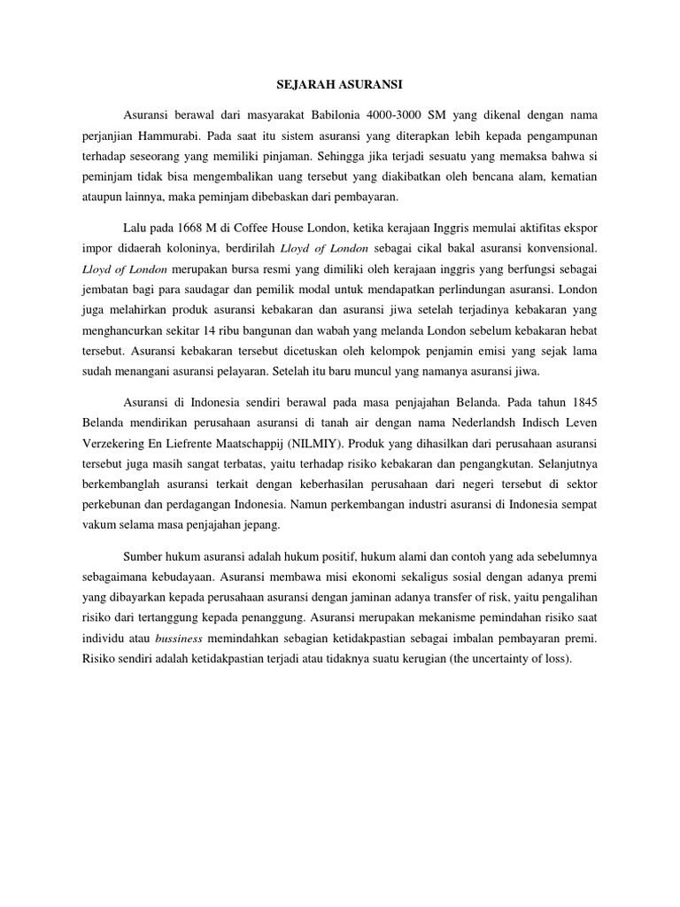 16. apr. 2018 ... Asuransi merupakan perjanjian dua belak pihak antara perusahaan asuransi dan nasabah (dalam asuransi itu disebut dengan pemegang polis) . Dalam ...