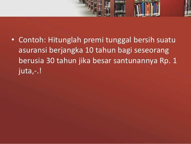 Dec 13, 2021 · BNI Life Insurance. Meski tergolong baru di tahun 2021 ini, BNI Life sudah mampu memasuki daftar salah satu market leaders asuransi jiwa Indonesia 2021. Produk salah satu asuransi jiwa terbaik di Indonesia ini ditawarkan melalui 4 saluran distribusi, yaitu Agency, Employee Benefits, Bancassurance, dan Syariah. Jenis-jenis produk asuransi jiwa terdiri atas asuransi jiwa berjangka dan asuransi jiwa seumur hidup . Adapun asuransi term life memberikan pertanggungan dalam jangka waktu tertentu saja, mulai dari setahun, 5, 10, 20, dan maksimal 30 tahun. Sementara asuransi whole life memberikan pertanggungan seumur hidup. Contoh asuransi jiwa 01.05.2018 · Kendala-kendala tersebut antara lain : 1. Tolak ukur 2. Penyeleksi 3. Pelamar Tujuan Seleksi Seleksi merupakan fungsi yang penting karena berbagai macam keahlian yang dibutuhkan oleh perusahaan untuk mencapai tujuannya diperoleh dari proses seleksi. Proses seleksi akan melibatkan proses menduga yang terbaik (best-guest) dari pelamar yang ada.
