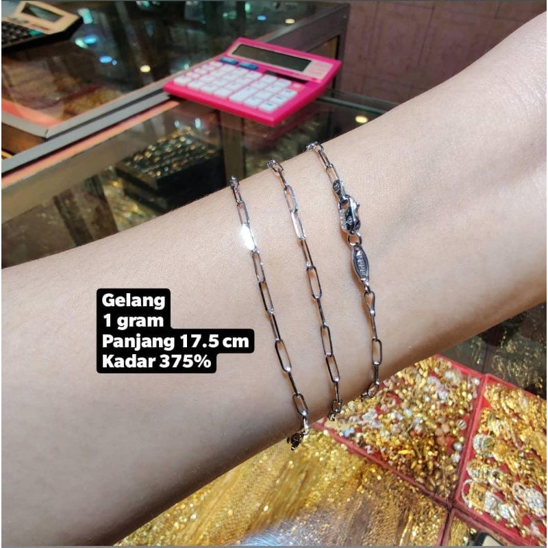 Review & Daftar Harga Gelang Emas Putih Terbaru 2022. Gelang Emas Putih. Penjelasan Gelang Emas Putih Gelang emas putih adalah perhiasan berupa gelang yang terbuat dari material emas putih. Gelang ini bermacam-macam desainnya. Selain itu, berat dan kadarnya juga bervariasi. Gelang berbahan emas putih terlihat anggun serta cantik saat dikenakan.