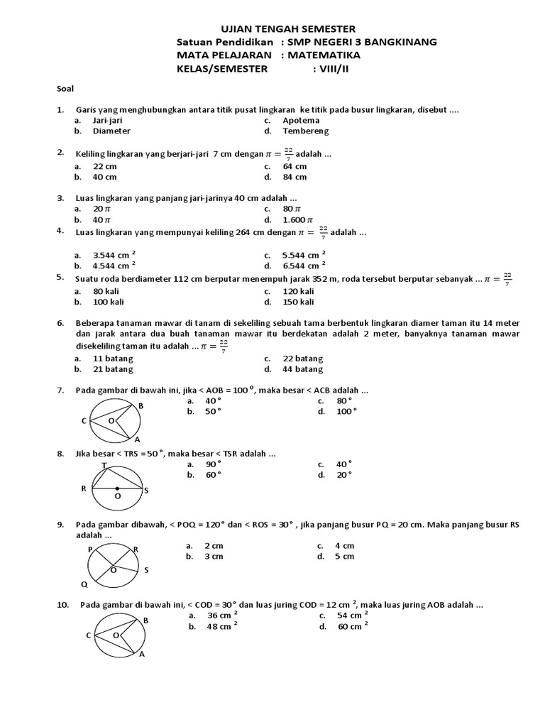 PDF. Download Full PDF Package. PENILAIAN AKHIR SEMESTER (PAS) GANJIL SEKOLAH MENENGAH PERTAMA (SMP)/ MADRASAH TSANAWIYAH (MTs) KURIKULUM 2013 LEMBAR SOAL Mata Pelajaran : Matematika Kelas/Semester : VII/ I Hari/Tanggal : Waktu : 120 menit Petunjuk Khusus : Hitamkan bulatan pada huruf a, b, c, atau d yang anda anggap benar dalam lembar jawaban 1.