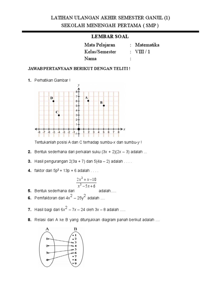 Download Latihan Soal Uas Matematika Kelas 8 Semester 1. Type: PDF. Date: August 2019. Size: 311.1KB. Author: Kartika Syskya Wydya. This document was uploaded by user and they confirmed that they have the permission to share it. If you are author or own the copyright of this book, please report to us by using this DMCA report form. Report DMCA.
