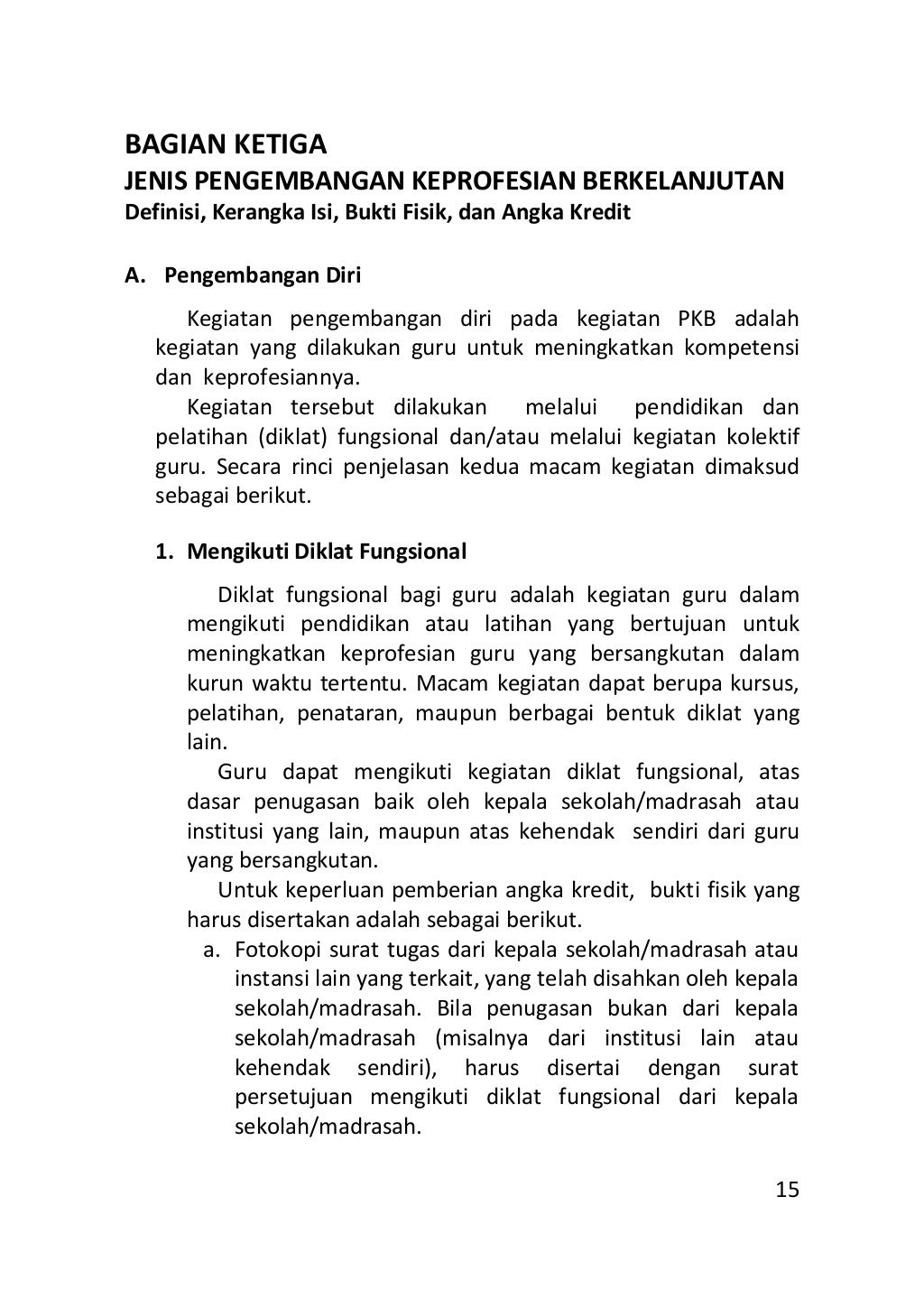 Buku ini merupakan Pedoman Kegiatan Pengembangan Keprofesian ... Besaran Angka Kredit untuk Buku Pedoman Guru… ... Fungsional Guru dan Angka Kreditnya.85 pages 10. Peraturan Menteri Pendidikan Nasional Nomor 35 Tahun. 2010 tentang Petunjuk Teknis Pelaksanaan Jabatan. Fungsional Guru dan Angka Kreditnya;. MEMUTUSKAN:.17 pages