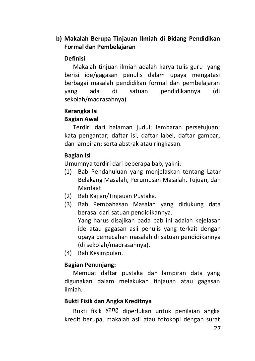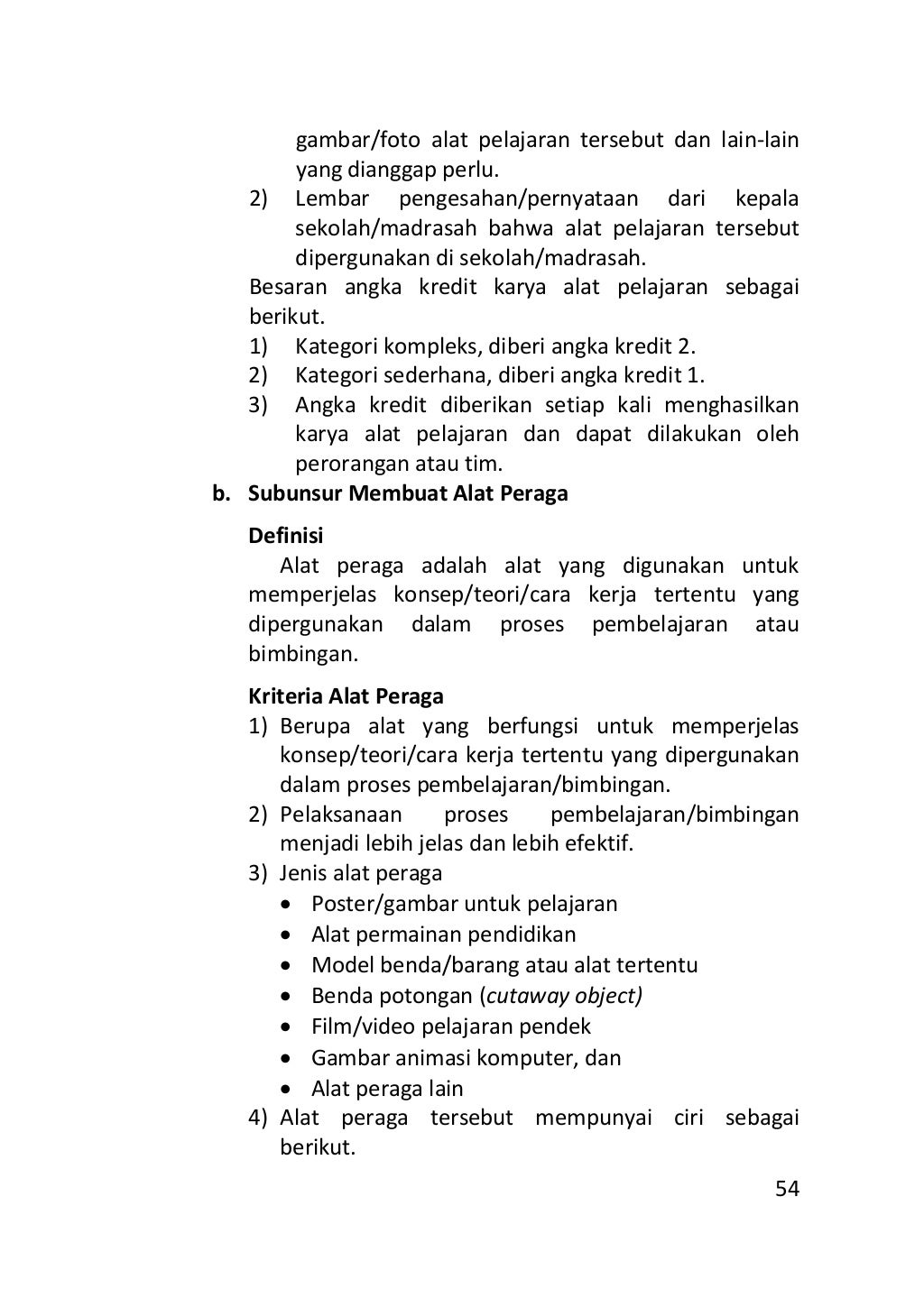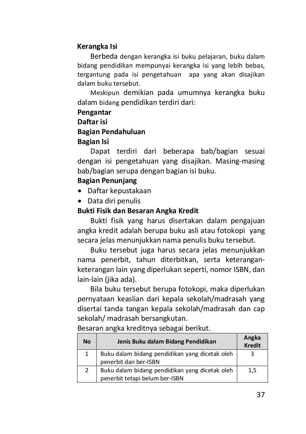 Publikasi Buku Teks Pelajaran, Buku Pengayaan, dan/atau Pedoman Guru Publikasi ilmiah pada kelompok ini terdiri dari: a) Buku Pelajaran b) Modul/Diktat Pembelajar an c) Buku dalam Bidang Pendidik an d) Karya Terjemahan e) Buku Pedoman Guru Penjelasan tentang definisi, kerangka isi, bukti fisik, dan besaran angka kredit dari masing- masing jenis publikasi di atas disajikan sebagai berikut. Pedoman Penetapan Angka Kredit Pengawas Madrasah menjadi acuan bagi para ... Melaksanakan pembinaan guru dan / atau kepala madrasah (8,00 setiap laporan) c. Memantau pelaksanaan standaar isi, standar proses, standar kompetensi lulusan, standar pendidik dan tenaga kependidikan, standar Selanjutnya adalah angka kredit yang diperkenankan untuk melaksanakan kegiatan yang dapat dipertimbangkan sebagai unsur penunjang, maksimum angka kredit untuk unsur penunjang 10 % dari kebutuhan angka kredit. Contoh, jika seorang guru membutuhkan 100 angka kredit untuk naik pangkat, maka jumlah angka kredit dari unsur penunjang adalah 10% dari 100.