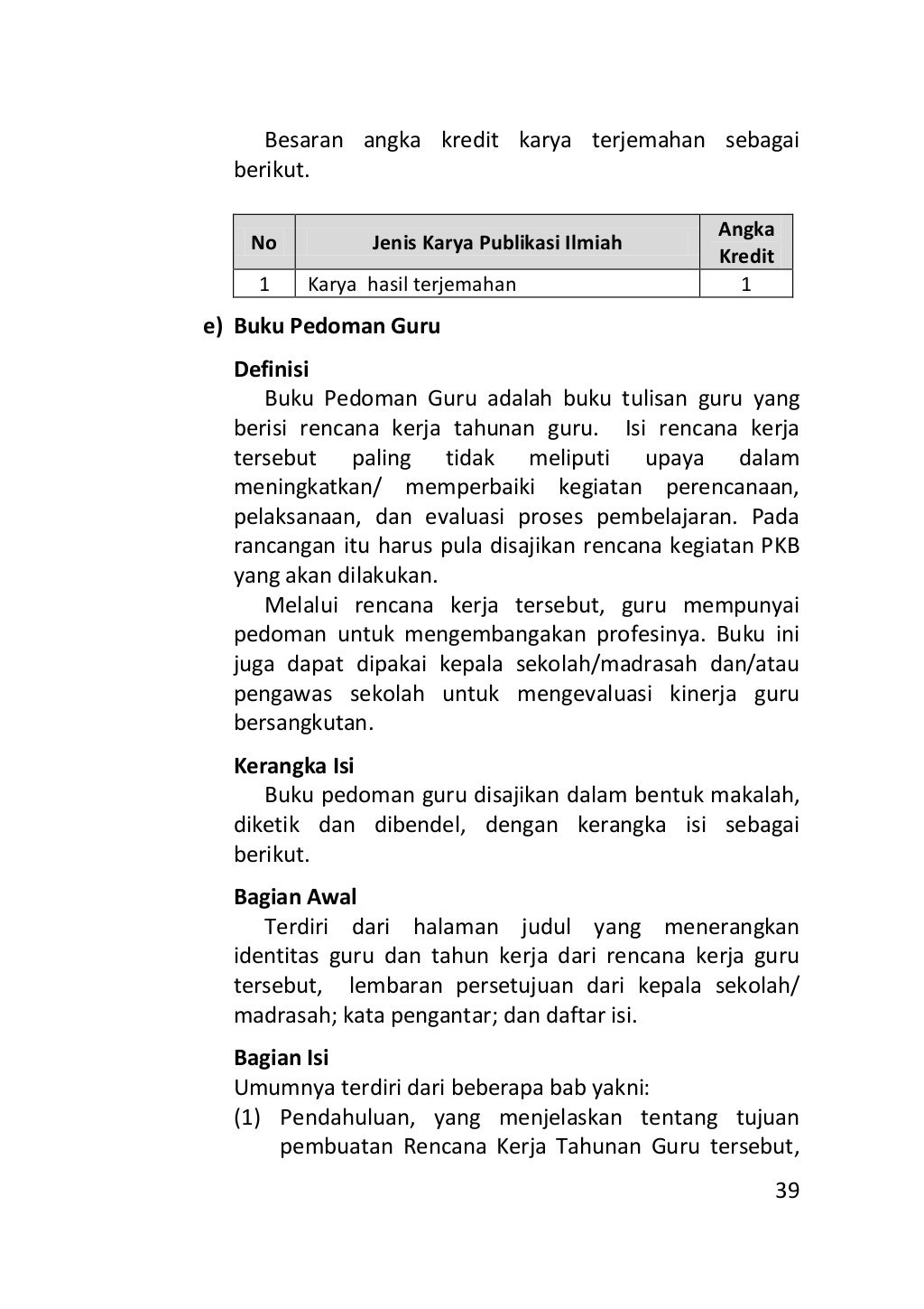 Angka No Jenis Karya Publikasi Ilmiah Kredit 1 Karya hasil terjemahan 1 e) Buku Pedoman Guru Definisi Buku Pedoman Guru adalah buku tulisan guru yang berisi rencana kerja tahunan guru. Isi rencana kerja tersebut paling tidak meliputi upaya dalam meningkatkan/ memperbaiki kegiatan perencanaan, pelaksanaan, dan evaluasi proses pembelajaran.