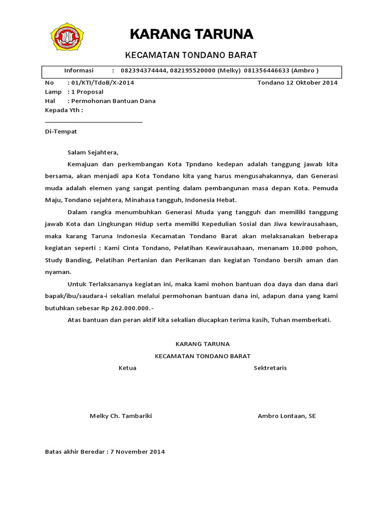 CONTOH PROPOSAL DAN KARANG TARUNA - 123dok CONTOH PROPOSAL KARANG TARUNA. Nomor : 01/ OVEX/IX/2012 Kepada : Lampiran : 1 ( Satu) Bundel Yth. Bapak Bupati . Perihal ... Demikian proposal pengajuan bantuan dana ini kami sampaikan, sudilah kiranya Bapak untuk dapat memperhatikan serta kami sampaikan banyak terima kasih. ... Contoh Proposal Bantuan Dana Karang Taruna "Kesuma ... Contoh Proposal Bantuan Dana Karang Taruna "Kesuma". MTJ Blog di 19.06 Karang Taruna, Proposal, Contoh Proposal Karang Taruna meliputi bagian dari contoh proposal tenis meja, pembiayaan pembuatan program karang taruna, Permohoan Bantuan Dana karang taruna. nastain.com › contoh-proposal-bantuan-danaContoh Proposal Bantuan Dana Paling Lengkap - Nastain.com Jan 01, 2019 · Pengajuan proposal ini bertujuan untuk memberikan gambaran acara peringatan Maulid Nabi berupa Pengajian Akbar sebagai kegiatan rutin yang dilakukan oleh Karang Taruna Dusun Kedungrejo, Sambimulyo. Pengajuan proposal ini bertujuan untuk memohon bantuan dana untuk menyelenggarakan kegiatan pengajian akbar dalam rangka peringatan Maulid Nabi SAW. Proposal Permohonan Bantuan Dana karang taruna 02 Proposal ini kami buat guna menyalurkan aspirasi rekan muda yang sangat antusias dalam kegiatan karang taruna dan sebagai wujud tanggung jawab kami sebagai pengurus melihat kondisi sarana bagi karang taruna yang kurang memadai. Besar harapan kami mudah-mudahan kebutuhan kami dapat terakomodir serta terealisasi. Amin.