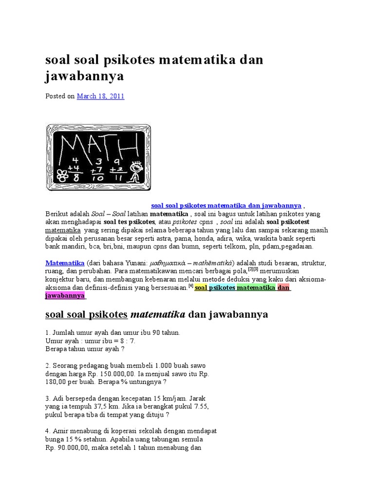 100 Contoh Soal Psikotes dan Jawabannya (Lengkap) Berisi contoh soal psikotes online dan jawabannya untuk latihan. Contoh Soal Psikotes Antonim. LOKAL a. Jamak b. Tunggal c. Intelektual d. Universal e. Kedaerahan. Berapakah yang harus ditabung Farlodrian ke bank, agar dalam waktu 1 tahun uangnya menjadi Rp448 juta.