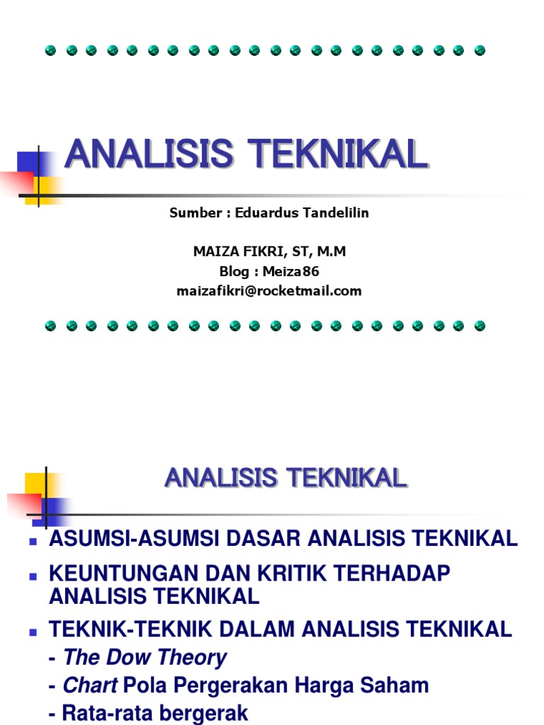 (Pdf) Analisis Teknikal Saham Dengan Perbandingan ... analisis investasi saham, yaitu analisis teknikal dan analisis fundamental. Meskipun demikian kenyataannya banyak investor dan spekulan yang tidak paham dengan analisis tersebut karena mereka ... PDF MATERI 13 - ANALISIS TEKNIKAL - WordPress.com ANALISIS TEKNIKAL n Para analis teknikal, juga disebut sebagai 'chartist' karena dalam aktivitasnya mereka merekam data atau membuat grafik (chart) pergerakan harga saham dan volume perdagangan . n Beberapa teknik penggunaan grafik (charting) dalam analisis teknikal, yaitu: 1. The Dow Theory 2. Chart pola harga saham 3. Analisis rata-rata ...