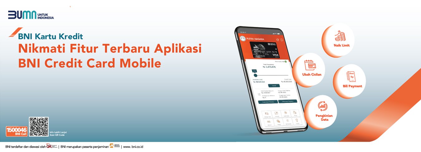 BNI Credit Card Mobile | BNI Credit Card BNI Credit Card Mobile adalah layanan Kartu Kredit BNI berbasis aplikasi yang membantu Pemegang Kartu Kredit BNI mendapatkan informasi kartu kredit yang dimilikinya melalui smartphone. Syarat dan Ketentuan Pemegang Utama Kartu Kredit BNI Visa, Mastercard, JCB (kecuali Corporate Card dan Hasanah Card). Memiliki Kartu Kredit dengan status Aktif.