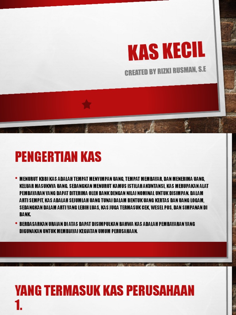 (PDF) Ruang Lingkup Dana Kas Kecil | Zuhdan Kamal Abdillah ... Ruang Lingkup Dana Kas Kecil Jurusan Otomatisasi dan Tata Kelola Perkantoran SMK N 9 Semarang Ruang Lingkup Dana Kas Kecil Siswa memahami materi tentang: 1. Pengertian Kas dan Kas Kecil 2. Alasan, tujuan, fungsi dan karakteristik kas kecil 3.