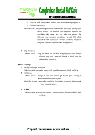 Contoh Business Plan Sederhana dan Cara Penyusunannya Dalam penyusunan contoh business plan sederhana, ketegasan tentang arah masa depan usaha harus jelas. Bisnis tidak boleh merupakan bagian dari usaha musiman yang akan merugikan enterpreneur bersangkutan ketika daya tariknya telah habis. mesinmilenial.com › contoh-bisnis-planContoh Bisnis Plan Sederhana : Minuman, Makanan Jan 30, 2022 · Banyak contoh bisnis plan sederhana yang dapat kamu buat, seperti bisnis plan tentang makanan, minuman, dan lainnya. Dengan membuat bisnis plan, kamu dapat mengetahui kejelasan bisnis, struktur, strategi bisnis, cara memasarkan bisnis, dan perhitungan bisnis yang akan dijalankan. Bisnis plan penting untuk dibuat dalam menjalankan sebuah bisnis. √ Contoh Rencana Bisnis Cafe yang Sederhana dan Lengkap Penjelasan di atas merupakan contoh rencana bisnis cafe yang sederhana. Contoh konsep bisnis kopi tersebut dapat menjadi inspirasi bisnis plan cafĂ© agar dapat dilirik investor yang diajak bekerjasama jangka panjang. Buatlah contoh bisnis plan yang jelas dan membuat investor puas dan tertarik. 5. Bab II Aspek Produksi dan Pemasaran.