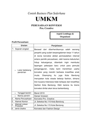 Contoh Business Plan Sederhana - Academia.edu BUSINESS PLAN A. Nama Usaha Nama usaha yang akan kami dirikan yaitu "Bolu Kukus". B. Produk Usaha ini bergerak di bidang produksi yaitu pengolahan dan pemasaran bolu kukus. Konsep bisnis ini menjual bolu kukus yang masih fres dan berkualitas tinggi.