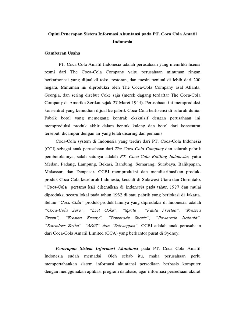 Laporan Praktek Kuliah Lapangan SIM PT Coca-cola Amatil ... Perusahaan produksi dan distribusi Coca-Cola di Indonesia ialah Coca-cola Amatil Indonesia. Perusahaan tersebut yang menjadi distributor produk Coca-cola untuk memenuhi permintaan pasar di seluruh Indonesia. Saat ini, Produk yang di produksi oleh Coca-Cola Amatil Indonesia tidak hanya minuman ringan berkarbonasi.