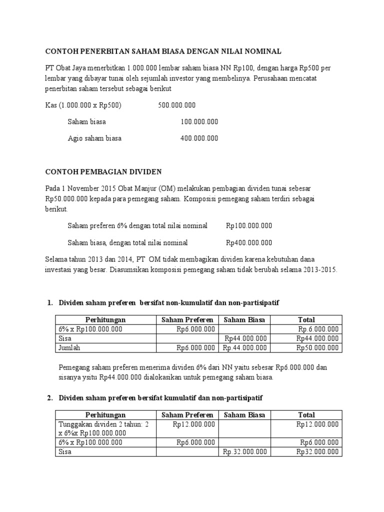 Contoh Soal Saham Preferen dan Saham Biasa Contoh soal saham preferen dan saham biasa akan menyebabkan jumlah saham yang tersebar makin banyak. Pembagian dividen saham biasa sering diberi dalam bentuk dividen. Jumlah saham yang beredar menjadi faktor penting untuk mencegah terjadinya modal saham disetor lebih besar daripada modal ditanam.