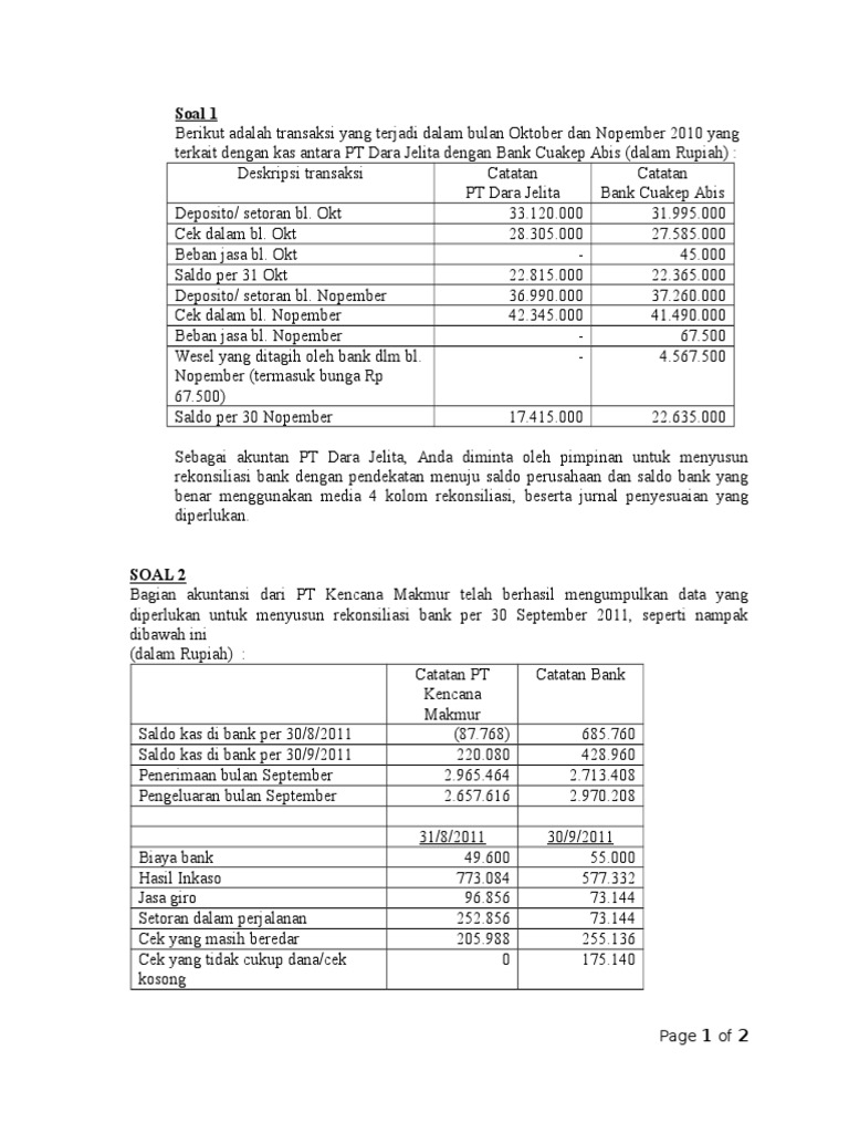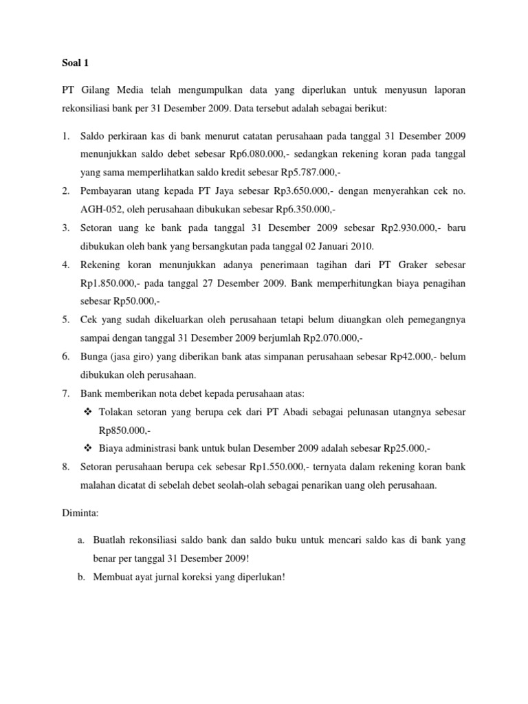 Soal rekonsiliasi bank dan jawabannya. Best Soal Tes Staff Accounting Dan Jawabannya SOAL REKONSILIASI BANK DAN JAWABANNYA Materi Akuntansi Sumber : . Last Record about Best Soal Tes Staff Accounting Dan Jawabannya. 28 Ags 2019 Tips Sukses Tes Dan Wawancara Posisi Staff Accounting Persiapkan jawaban untuk... manajemenkeuangan.net › jurnal-penyesuaian-adalahJurnal Penyesuaian Adalah | Fungsi, Contoh, Cara Membuat Jul 30, 2021 · Berikut ini disajikan contoh soal jurnal penyesuaian dan jawabannya perusahaan jasa salon: Soal: Salon “Cantikku” memberikan gaji mingguan pegawainya setiap hari Sabtu untuk enam hari kerja yang berakhir pada hari Sabtu. Besar gaji pegawai yang dikeluarkan adalah Rp 25.250.000. Contoh Lengkap Kumpulan Soal Rekonsiliasi Bank Contoh Rekonsiliasi Bank. Kasus Pertama: Bank ARTHA per tanggal 31 Desember mengeluarkan rekening koran yang ditujukan kepada PT. BIMA yang menunjukan saldo sebesar Rp.1.550.000,-. Jika dibandingkan dengan saldo kas di bank yang tercatat di buku besar PT. Contoh Soal Rekonsiliasi Bank Dan Jawabannya !! | PDF Rekonsiliasi antara saldo bank dan pembukuan PT Apes. terlihat sebagai berikut: PT Apes Rekonsiliasi Bank Bank X, 30 Juli 2010 Saldo per laporan bank (akhir periode) Ditamb Deposito dalam (1) ah: Perjalanan Dikuran Cek yang gi: Beredar Saldo kas Saldo per pembukuan Ditamb Jasa...