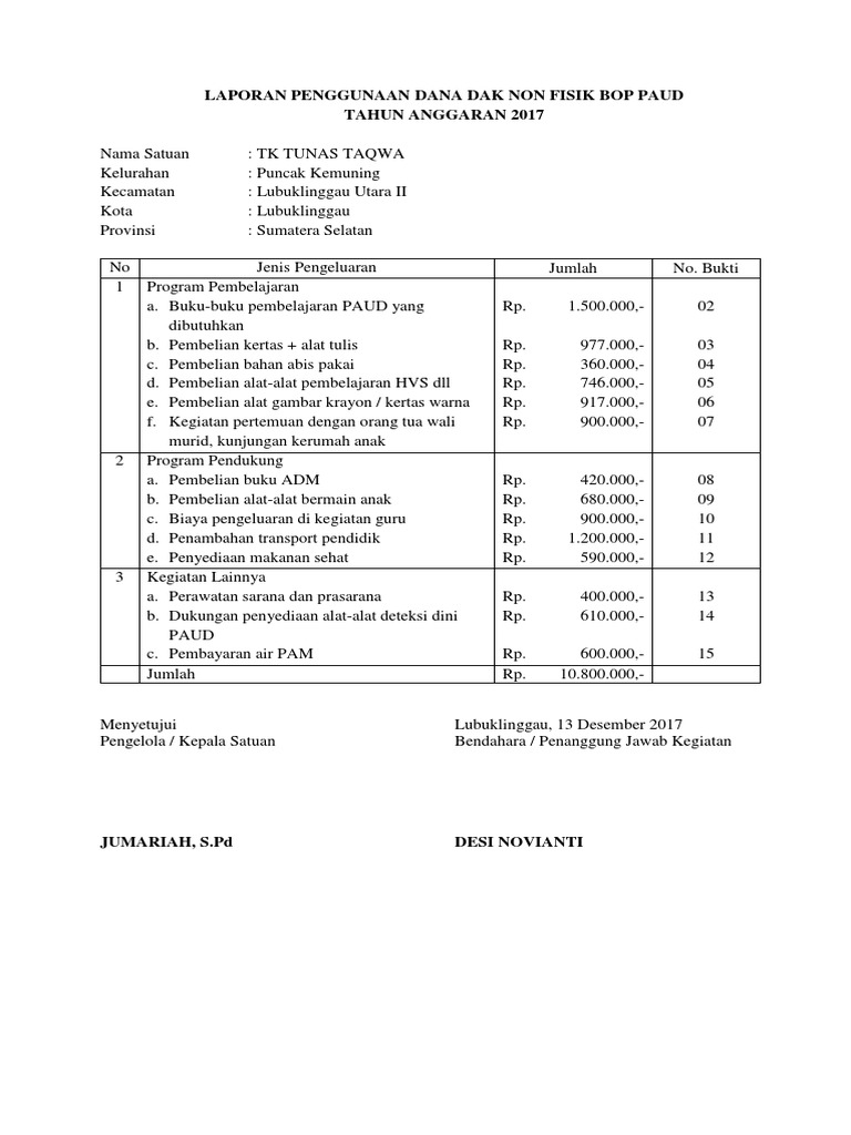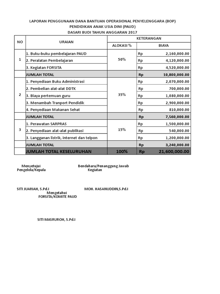 Contoh laporan penggunaan dana bop paud