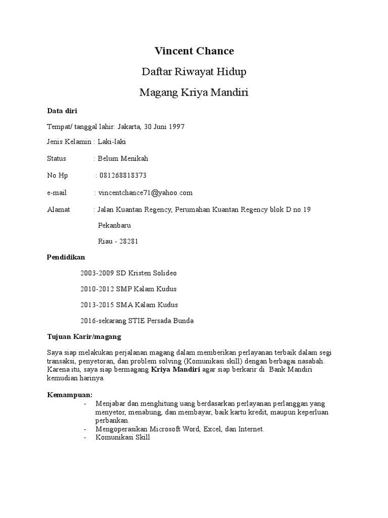 Contoh Surat Lamaran Kerja di Bank Mandiri pada Berbagai ... Contoh Surat Lamaran Kerja di Bank Mandiri pada Berbagai Posisi Dalam sejarah pendiriannya, Bank Mandiri merupakan penggabungan empat bank milik pemerintah. Surat Lamaran Kerja Kriya Mandiri ~ contoh surat lamaran Contoh Surat Lamaran Kerja Di Bank Mandiri Contoh Surat Lowongan Kerja Pt Bank Mandiri Persero Tbk Indonesia 2020 Bukajobs Com Pengalaman Kriya Mandiri Bank Mandiri Posisi Teller Irma Assignment Program Kriya Mandiri Bank Mandiri 2019 Lowongan Kerja Kalimantan Tengah Kirimkan Ini lewat Email ... 6 Contoh Surat Lamaran Kerja di Bank yang Baik dan Benar Aug 15, 2021 — Contoh Curriculum Vitae untuk Fresh Graduate. Bandung, 14 Oktober 2021. Hal: Lamaran Pekerjaan. Kepada Bapak/Ibu Staff Personalia Bank Mandiri. Contoh Surat Lamaran Untuk Bank Muamalat / Contoh Surat ... Contoh surat lamaran kerja di bank bri, mandiri, bni, bca, muamalat. Contoh surat lamaran kerja di bank bri adalah contoh surat yang akan saya bagikan pada kesempatan ini, terutama bagi anda . Contoh surat lamaran kerja di bank sobat, jika anda ingin melamar kerja di suatu bank tentunya sobat memerlukan contoh surat lamaran kerja .