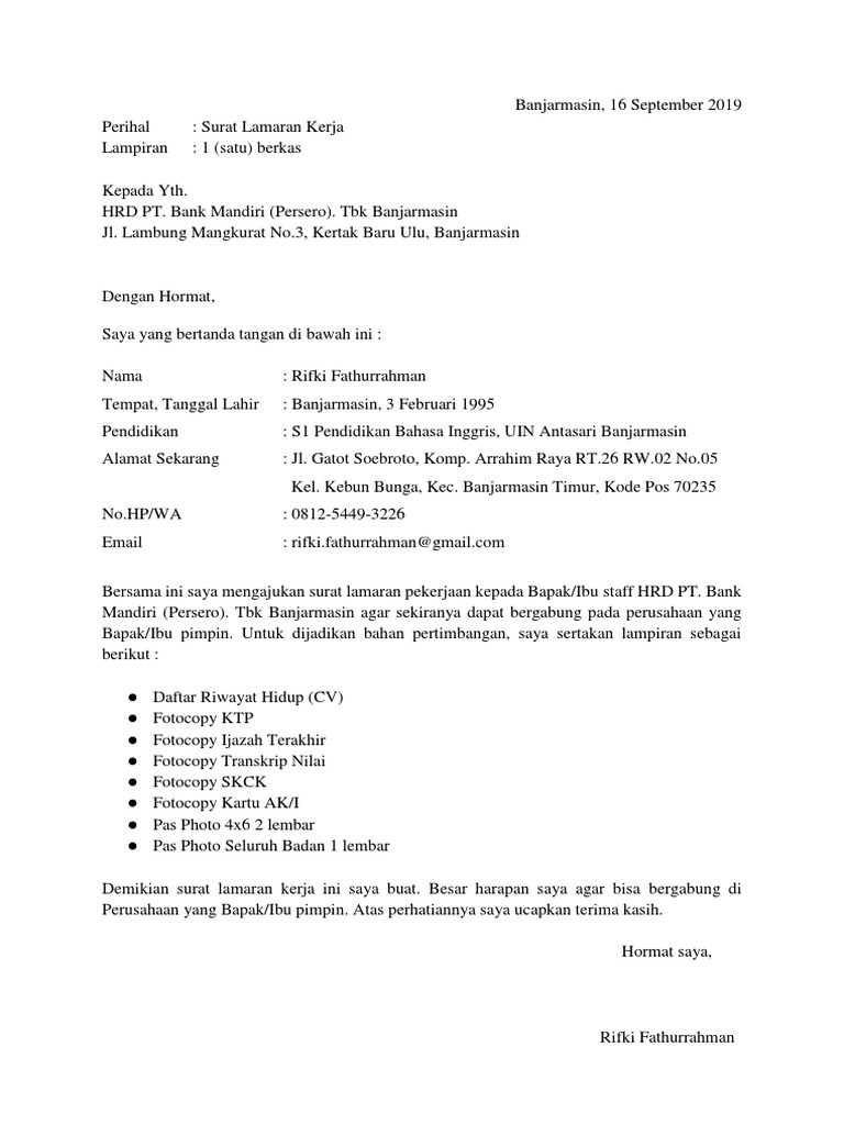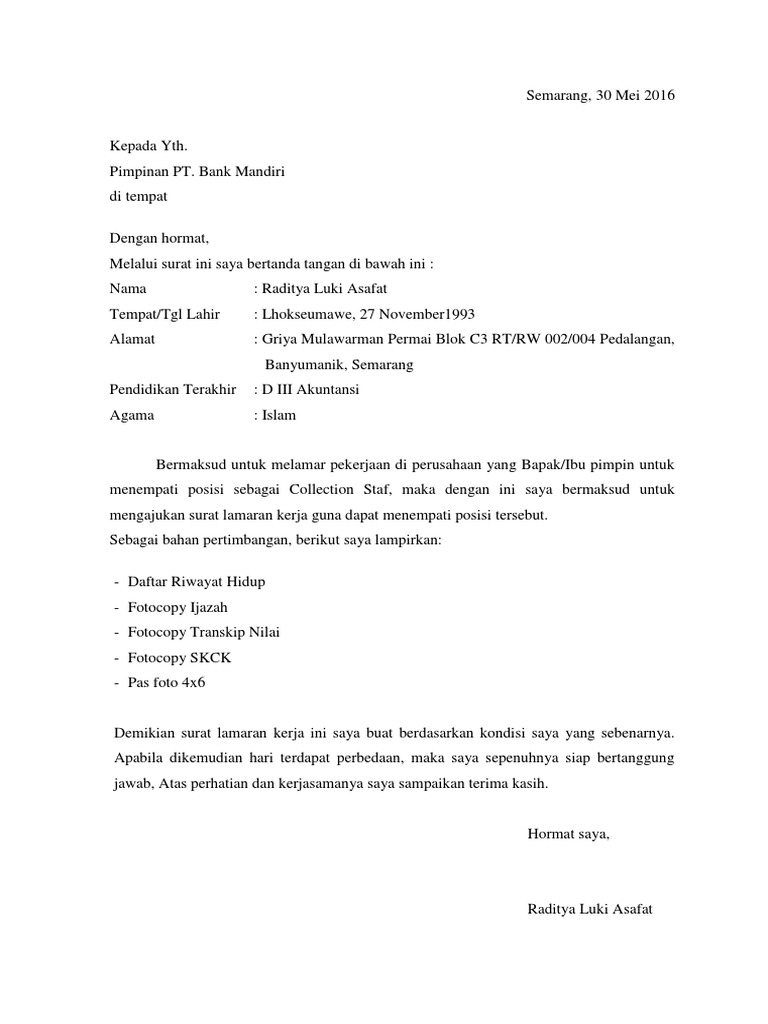 Contoh Surat Lamaran Pekerjaan Di Bank Mandiri - Format Surat Mulai dari bni, mandiri, bpr, bca, mandiri syariah, ataupun ke bri. contoh format surat lamaran kerja di bank. Langsung saja bagi yang sedang mencari contoh membuat surat lamaran kerja lihat dibawah ini. Let me introduce my self, my name is rosalina puspita, i am twenty seven years old. Hz mustofa 151 tasikmalaya up.