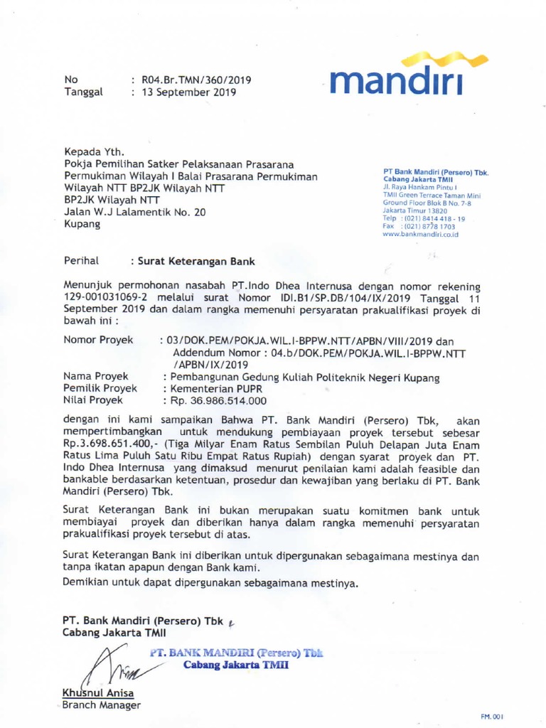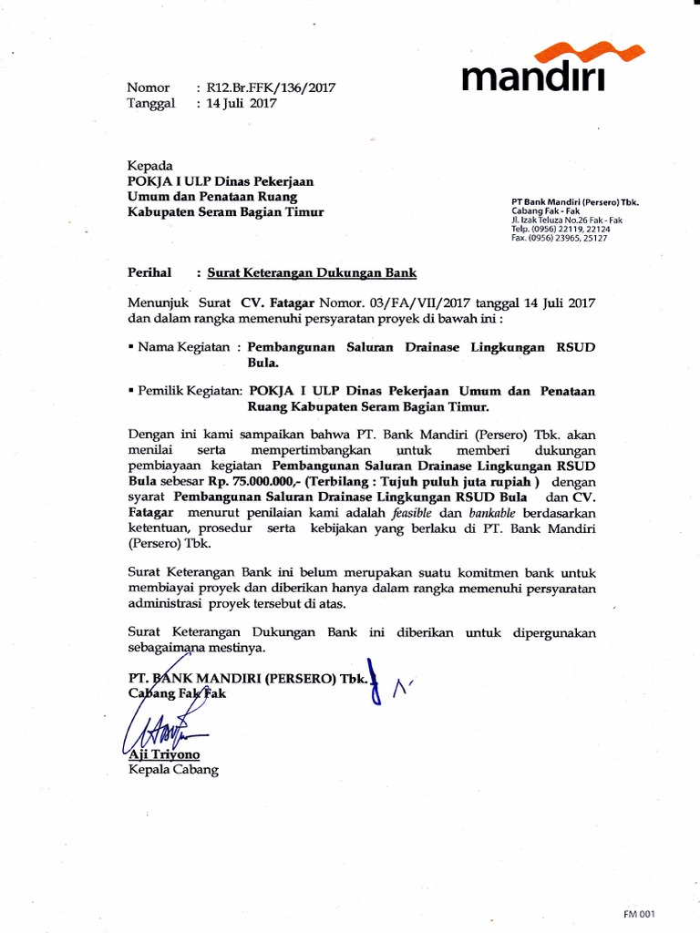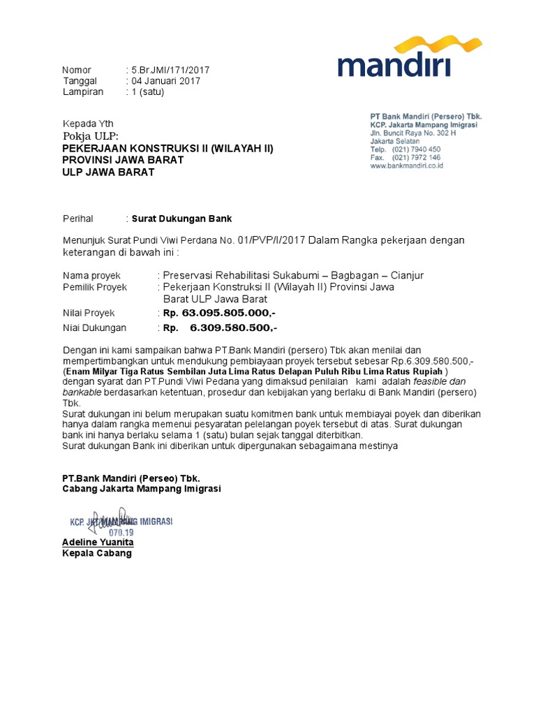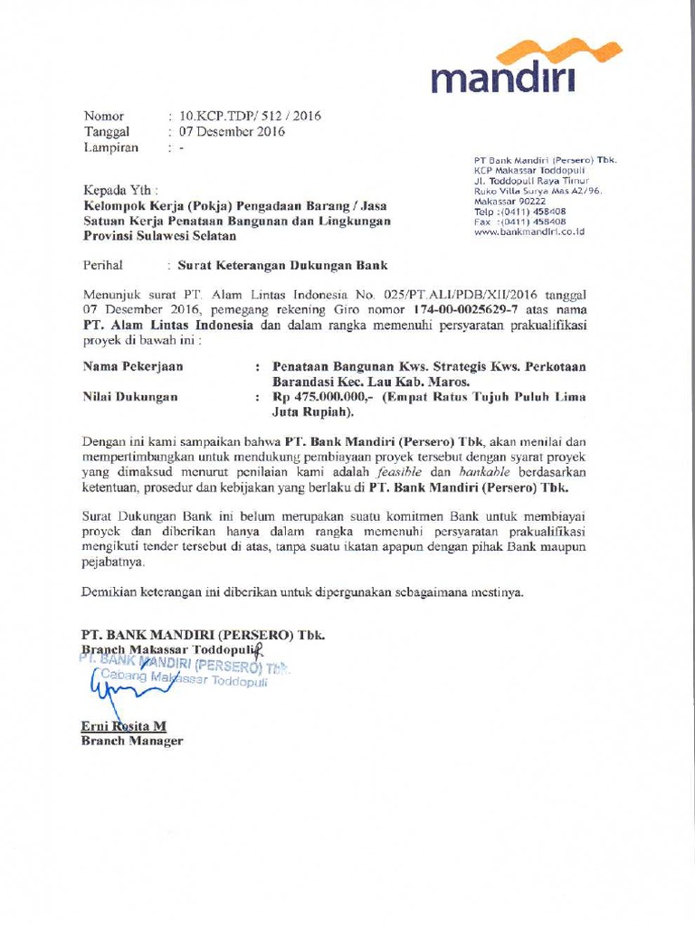 Surat dukungan bank mandiri. dukungan keuangan dari bank untuk pekerjaan konstruksi Surat dukungan dari bank bukan sekedar surat tanpa ada komitmen dana. Namun dalam hal di dokumen pengadaan, tidak jelas mengenai bagaimana format atau kriteria dukungan keuangan dari bank, penawaran penyedia dengan adanya surat dukungan bank tidak bisa digugurkan dari aspek dukungan keuangan bank bila ternyata surat dukungan tersebut hanya ... Surat Dukungan Bank Surat Dukungan Bank bukan merupakan komitmen yang mengikat bagi bank untuk merealisasikannya, mengingat realisasi dukungan tersebut sepenuhnya didasarkan pada: Hasil analisa Bank terhadap kelayakan nasabah dan proyek apabila nasabah sudah ditetapkan sebagai pemenang tender/ditunjuk sebagai pelaksana proyek; (DOC) CONTOH SURAT DUKUNGAN BANK | aminah azahra By Dwika Raga Putra. Analisis penyertaan modal pemerintah Kota Depok pada PT Bank Jawa Barat dan Banten (Bank BJB) By Dikky Indrawan. KONTRA MEMORI BANDING EDDIE WIDIONO SUWONDHO. By Hendrawarman Koto. Annual Report 2015 KPK.pdf. By Hans Wakhida. 42 contoh surat referensi bank untuk pembukaan rekening ... Mar 22, 2015 · 15 Contoh Surat Dukungan Tanda Tangan. Surat Pemberitahuan Nasabah Bank Syariah Mandiri. Contoh Surat Permohonan Referensi Bank Jatim Contoh Surat. Pt Bank Mandiri Persero Tbk Dan Anak Perusahaan. Surat Permohonan Dukungan Bank Guru Paud. Mandln Rekening. Contoh Surat Dukungan Bank Untuk Lelang Id Lif Co Id. Referensi Cimb Niaga.