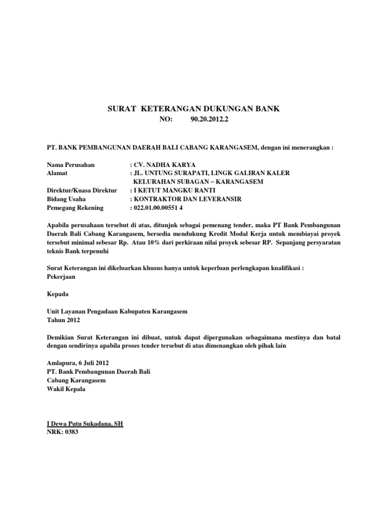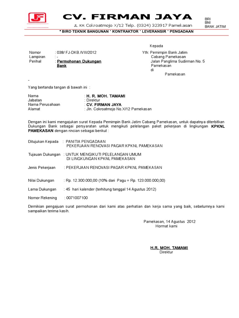 Contoh Surat Permohonan Dukungan Bank dan Cara ... Surat dukungan ini diberikan untuk mengikuti pelelangan paket pekerjaan Normalisasi Sungai Kabaena Timur dan batal/berakhir dengan sendirinya apabila asli dari surat dukungan ini dikembalikan ke BPD-Sultra. Demikian disampaikan, agar yang berkepentingan maklum. Tasikmalaya, _____ CV. _____ Direktur Contoh Format Surat Dukungan Bank ke-2