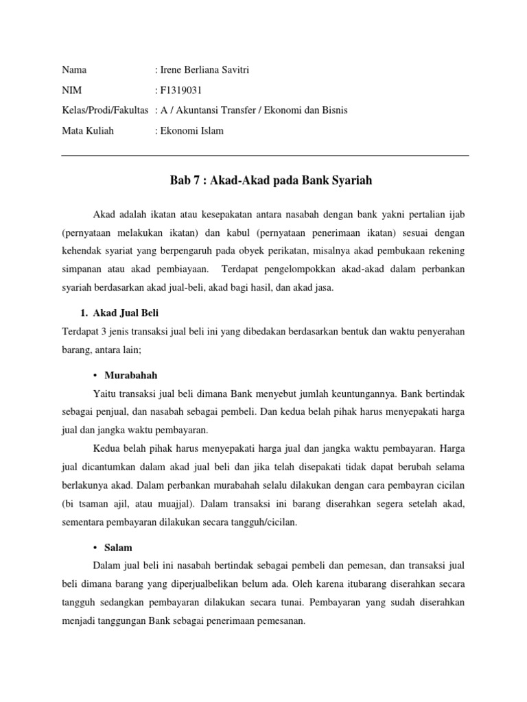 Akad-akad dalam transaksi Bank Syariah - SahamOK Akad-akad dalam transaksi Bank Syariah. Edison Sutan Kayo. 20, Agustus 2017 | UPDATED ON: 8, Januari 2020. Akad adalah ikatan atau kesepakatan antara nasabah dengan bank yakni pertalian ijab (pernyataan melakukan ikatan) dan kabul (pernyataan penerimaan ikatan) sesuai dengan kehendak syariat yang berpengaruh pada obyek perikatan, misalnya akad ... Jenis Akad Dalam Perbankan Konvensional dan Syariah ... Jenis-jenis Akad Perbankan. 1. Bank Syariah - Akad Istishna' Akad Istishna' adalah akad yang digunakan dalam transaksi jual beli dengan adanya pemesanan barang lalu pembayaran dilakukan dengan cara dicicil. Dalam akad istishna' terdapat beberapa istilah lain seperti Almashnu yakni narang pesanan dalam transaksi akad ishtisna'. Tentang Syariah Akad kerjasama suatu usaha antara pihak pertama (malik, shahibul mal, atau bank syariah) yang menyediakan seluruh modal dan pihak kedua ('amil, mudharib, atau nasabah) yang bertindak selaku pengelola dana dengan kesepakatan yang dituangkan dalam akad, sedangkan kerugian ditanggung sepenuhnya oleh Bank Syariah kecuali jika pihak kedua melakukan ... Akad-Akad Dalam Bank Syariah.docx - AKAD-AKAD DALAM BANK ... C. Tujuan 1. Menjelaskan Akad dan Waad 2. Memaparkan macam-macam akad dalam Bank Syariah BAB II PEMBAHASAN A. Pengertian Akad Dan Wa'ad Akad dan Wa'ad dalam konteks fiqih muamalah merupakan hal yang berbeda meskipun keduanya hampir sama yang merupakan bentuk perjanjian. Akad merupakan suatu kesepakatan bersama antara kedua belah pihak atau lebih baik secara lisan, isyarat, maupun tulisan ...