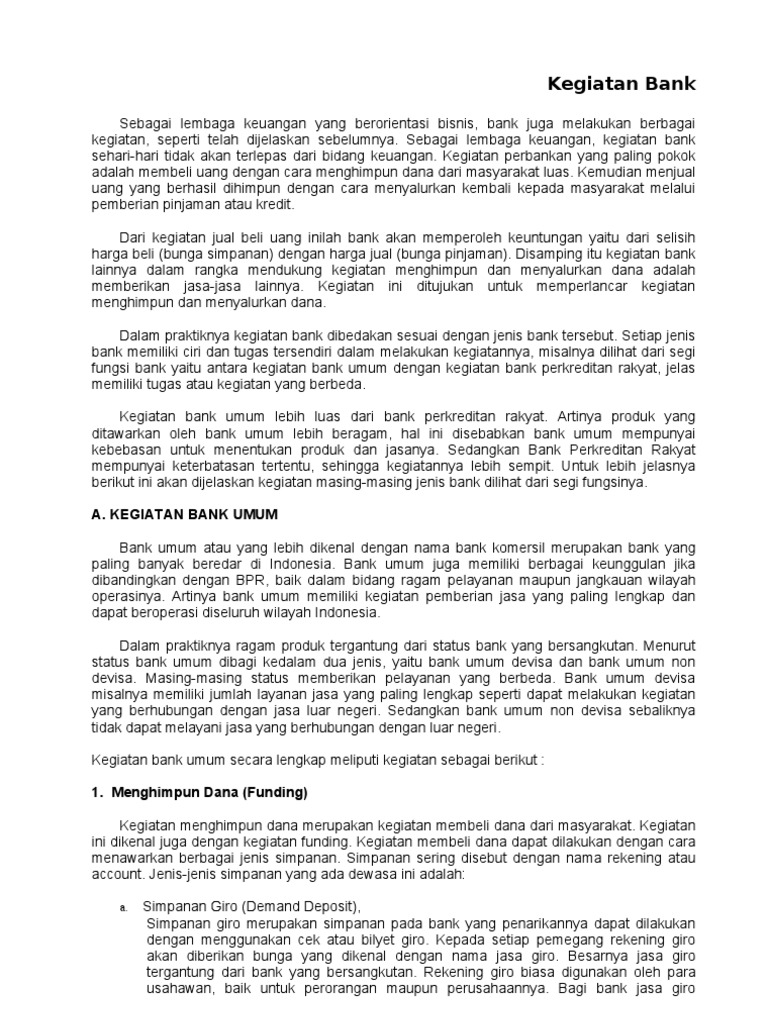 Fungsi Bank dan Mengenal Kegiatan Operasionalnya - Cermati.com Jenis bank yang satu ini adalah bank yang melaksanakan kegiatan mengumpulkan dana serta memberikan layanan jasa keuangan kepada masyarakat. Berikut kegiatan-kegiatan bank umum yang dilakukan untuk menjalankan fungsi utama perbankanya. 1. Penghimpunan Dana.