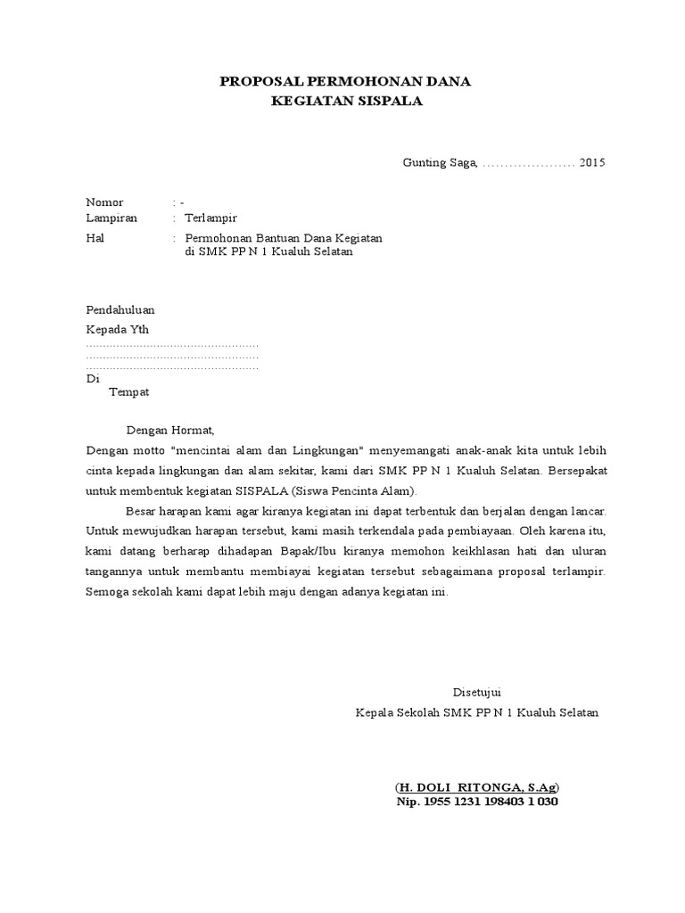 CONTOH PROPOSAL BANTUAN DANA KEGIATAN - Belajar menjadi ... Oleh karena itu saya akan memberikan contoh proposal bantuan dana yang sering dipergunakan untuk berbagai kegiatan. Contoh Proposal Kegiatan Dalam Bentuk Umum I Bagian muka (cover) a. judul proposal b. alamat c tahun II. Bagian Isi a. Pendahuluan b. Dasar-dasar c. Maksud dan Tujuan III. Rencana anggaran IV. Penutup Contoh Surat Permohonan Bantuan Dana Kegiatan yang Benar ... Nomor : 666/VII/2017. Lampiran : 1 rangkap proposal kegiatan. Perihal : Permohonan Bantuan Dana. Kepada Yang Terhormat, Direktur PT. Mekar Jaya. di tempat. Assalamu'alikum Wr. Wb. Salam sejahtera kami panjatkan, semoga kita senantiasa dalam lindungan Allah S.W.T dan senantiasa mendapatkan berkah serta kemudahan rizqi dari-Nya, Aamiin. Contoh Proposal Bantuan Dana, Kegiatan Sekolah dan ... Agar jelas, berikut disajikan contoh struktur proposal bantuan DANA, kegiatan dan undangan lomba terbaru, diantaranya: 1. Cover proposal Paling atas ada covert proposal yang wajib menginformasikan soal pembuat propolsa, judul proposal apakah undangan, bantuan dana atau lomba.