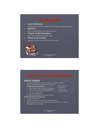 PDF 1 PENDAHULUAN 1.1. Latar Belakang Masalah permasalahannya adalah: Setiap bisnis usaha yang akan dibangun perlu dilakukan studi kelayakan bisnis, hal ini untuk mengetahui apakah usaha yang akan dijalankan memang layak untuk dijalankan. Pada penelitian ini, diperoleh analisis kelayakan bisnis dengan perhitungan ROI sebesar 28.70 % , PBP = 1,59 Tahun, NPV=11.871.837, BEP sebesar 166,34 dan