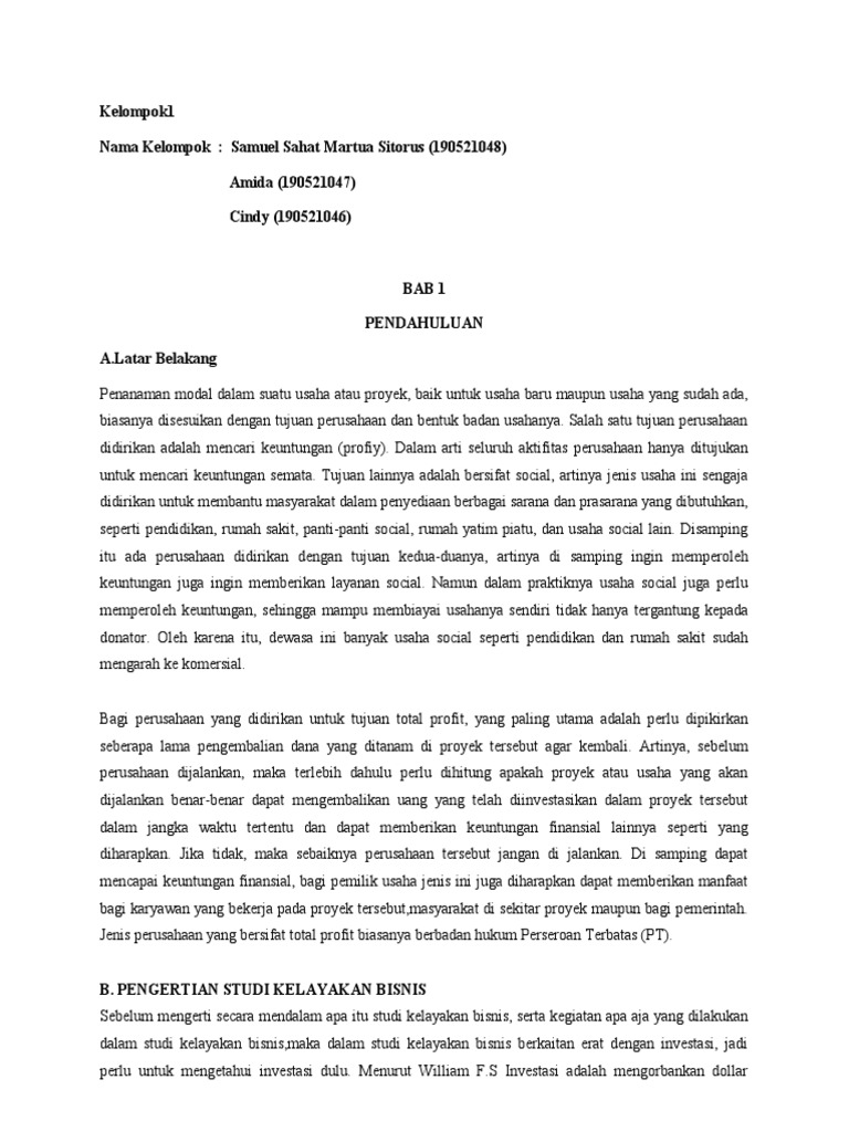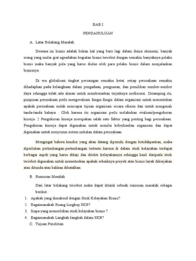 PDF BAB I PENDAHULUAAN A. Latar Belakang - UMS Studi kelayakan bisnis yaitu suatu pengkajian secara menyeluruh dan teliti terhadap rencana penanaman modal dan menilai apakah rencana investasi tersebut memenuhi syarat untuk dilaksanakan atau tidak, atas pertimbangan kelayakan finansial. Ahmad Hafijudin: Makalah Analisis Study Kelayakan Bisnis Berdasarkan uraian dalam latar belakang penelitian di atas, penelitian ini akan mengangkat topik tentang Studi Kelayakan Bisnis di Desa Sampiran Kecamatan Talun Kabupaten Cirebon. Bisnis ini dipilih karena semakin banyak peluang usaha disekitar lingkungan dan minat masyarakat sekitar akan daya beli bisnis yang kami analisis. Makalah Analisis Bisnis dan Kelayakan Usaha Studi kelayakan usaha dilakukan untuk mengidentifikasi masalah di masa yang akan dating, sehingga dapat meminimalkan kemungkinan melesetnya hasil yang diinginkan dalam suatu investasi. Studi kelayakan usaha memperhitungkan hambatan atau peluang dari investasi yang akan dijalankan.