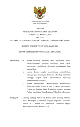 Peraturan OJK No. 38/POJK.03/2019 Tahun 2019 tentang ... Nomor 38/POJK.03/2019 Tahun 2019 Judul Peraturan Otoritas Jasa Keuangan tentang Perubahan Atas Peraturan Otoritas Jasa Keuangan Nomor 32/POJK.03/2018 tentang Batas Maksimum Pemberian Kredit dan Penyediaan Dana Besar Bagi Bank Umum Ditetapkan Tanggal 19 Desember 2019 Diundangkan Tanggal Berlaku Tanggal 19 Desember 2019 Sumber Jdih.ojk.go.id: 63 hlm. Peraturan OJK No. 16 /POJK.03/2018 Tahun 2018 tentang ... Peraturan Otoritas Jasa Keuangan Nomor 16 /POJK.03/2018 Tahun 2018 Perubahan atas POJK Nomor 44/POJK.03/2017 tentang Pembatasan Pemberian Kredit atau Pembiayaan oleh Bank Umum untuk Pengadaan Tanah dan/atau Pengolahan Tanah Detail Peraturan Abstrak Jenis Peraturan Otoritas Jasa Keuangan Entitas Otoritas Jasa Keuangan Nomor 16 /POJK.03/2018 Tahun