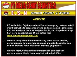 Melia Sehat Sejahtera Melia Sehat Sejahtera adalah sebuah perusahaan Multilevel Marketing di indonesia yang pertama kali membuat terobosan terbaru di sistem marketing plan yang berpihak kepada member, yaitu: Sistem Pembayaran Bonus Harian tanpa syarat Jenis dan perhitungan bonus yang sederhana, transparan tidak ada yang ditutup tutupi.