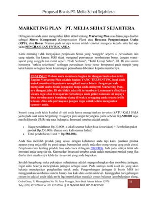 Marketing Plan ~ PT Melia Sehat Sejahtera Setiap Anda membeli 1 paket produk, Anda akan mendapatkan 1 unit/titik bisnis dengan potensi penghasilan Rp.850.000/hari untuk bonus harian (Bonus Leadership, di luar dari Bonus Sponsor) dan Rp.86 juta/bulan untuk bonus bulanan (Bonus Unilevel) FORMAT JARINGAN : BINARY (2 KAKI) (Membina 2 Tim saja, di Kiri dan di Kanan setiap unit Anda)