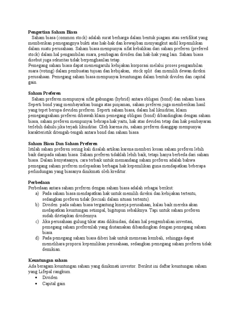 Mengenal 4 Perbedaan Saham Biasa dan Saham Preferen 1. Saham biasa independen, saham preferen gabungan intinya.com Saham biasa (common stock) didaftarkan oleh perusahaan dan merupakan saham atau surat berharga yang menempatkan pemiliknya, dalam hal ini perusahaan, pada posisi paling terakhir dalam pembagian dividen dan hak atas kekayaan perusahaan.