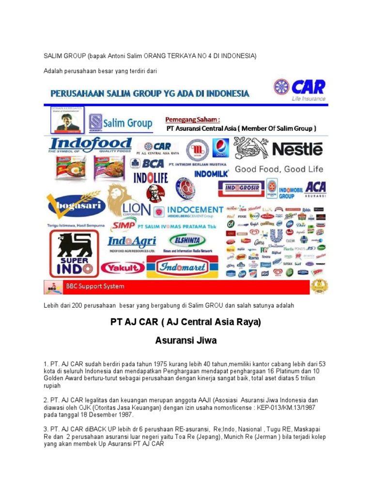 Penjelasan tentang PT AJ CENTRAL ASIA RAYA dan CAR 3i ... ASURANSI CAR adalah Program yang sangat luar biasa yang didirikan oleh SALIM Group. WIKIPEDIA menyatakan bahwa SALIM Group merupakan Perusahaan Konglomerat Terbesar di Indonesia yang mendirikan INDOFOOD yaitu perusahaan mie instan terbesar di Dunia, Selain itu SALIM Group juga mendirikan BCA, INDOMOBIL, INDOMARET, INDOCEMENT, INDOGROSIR dan ... Perusahaan Asuransi Salim Group Perdalam Kepemilikan di ... Bisnis.com, JAKARTA -- PT Asuransi Jiwa Central Asia Raya, milik Salim Group perdalam kepemilikan di PT Bank Ina Perdana Tbk. Per September 2019, saham perusahaan di bank berkode saham BINA ini naik dari sebelumnya 2,72 persen menjadi 5,22 persen. Berdasarkan keterbukaan informasi, Asuransi Jiwa Central Asia Raya membeli 141,36 juta lembar saham milik PT Gaya Hidup Masa Kini.