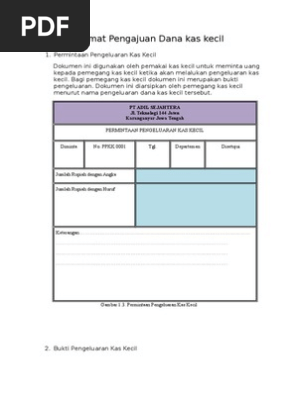 Format Pengajuan Dana Kas Kecil | PDF - Scribd fDokumen ini dibuat oleh pemakai dana kas kecil untuk mempertanggung-jawabkan pemakaian dana kas kecil. Dokumen ini dilampiri dengan bukti-bukti pengeluaran kas kecil dan diserahkan oleh pemakai dana kas kecil kepada pemegang dana kas kecil PT ADIL SEJAHTERA Jl. Teknologi 144 Jaten Telp 0271 3096858 Karanganyar Jawa Tengah Form Pengajuan Dana Kas Kecil / Contoh Formulir Pengajuan ... Bulan februari dana awal kas kecil : Menyerahkan form dan bukti pengajuan mencatat ke buku reimburse menerima uang memberikan form dan bukti start finish approved mengembalikan form dan bukti realisasi 3.untuk mendapatkan dana kas kecil, pemegang kas kecil harus membuat permohonan pengajuan dana kas kecil kepada. OTK Keuangan : Cara Pengisian Form Pengajuan Dana Kas Kecil About Press Copyright Contact us Creators Advertise Developers Terms Privacy Policy & Safety How YouTube works Test new features Press Copyright Contact us Creators ... kumpulanjurnal.download › p › download-filekumpulanjurnal.download kumpulanjurnal.download