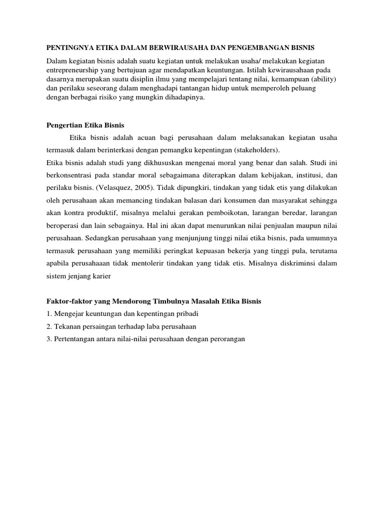 Etika Bisnis: Memahami Pentingnya Diterapkan di Perusahaan Etika Bisnis: Memahami Pentingnya Diterapkan di Perusahaan. Berbisnis telah menjadi pilihan anak muda saat ini. Tengok saja kedai kopi menjamur di jalan dan kedai makanan yang menarik selera, banyak konsumen berbondong-bondong mencicip sesuatu yang baru. Bisnis kuliner yang berkembang pesat, telah memicu terjadinya persaingan yang ketat. Pentingnya Mengenal Prinsip Etika Bisnis - Zahir Dari penjelasan tentang prinsip etika bisnis diatas dapat memberikan manfat dan memiliki peran penting pada suatu perusahaan, seperti untuk membentuk perusahaan yang kuat dan memiliki daya saing yang tinggi serta memiliki kemampuan untuk menciptakan nilai (value-creation) yang tinggi. Pentingnya Membangun Bisnis Yang Beretika - Belajar 90 ... Artikel "Pentingnya Membangun Bisnis Yang Beretika" Saya Sharekan dengan tujuan untuk menawarkan kepada para Pebisnis bahwa untuk mencapai kesuksesan dalam berbisnis diharapkan Etika Bisnis. Oleh sebab itu, Etika Bisnis mempunyai tugas yang sangat Penting Jika Pebisnis tersebut menginginkan Usaha mereka bertahan lama. Komentar Artikel : K9_Michael L. Micahael Pentingnya ... K9_Michael L. Micahael Pentingnya Memahami Business Ethics The Law Of Rules Dalam Berbisnis! 29 April 2022 21:56 Diperbarui: 29 April 2022 21:59 35 0 Michael L. Michael membahas tentang aturan hukum etika bisnis, menambahkan undang-undang dan peraturan ke bisnis baru saat masalah diselesaikan dengan tergesa-gesa, dan bagaimana sifat peraturan ...